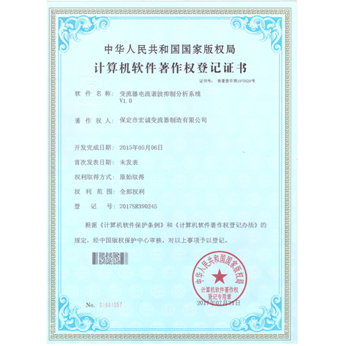 計算機軟件注冊權登記證書——變流器電流諧波抑制分析系統(tǒng)V1.0