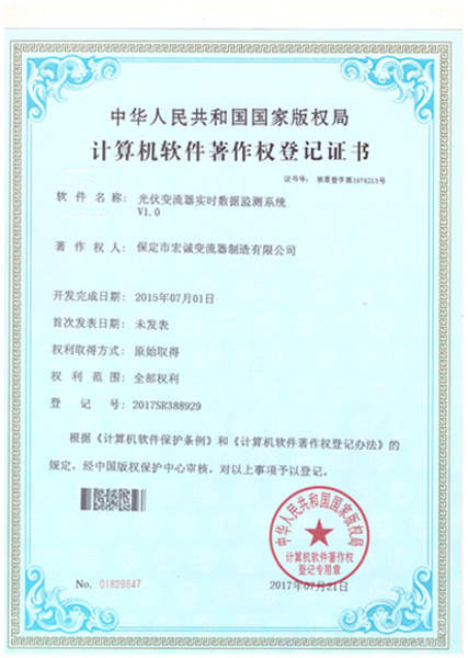 計算機軟件注冊權登記證書——光伏變流器實時數(shù)據(jù)檢測系統(tǒng)V1.0