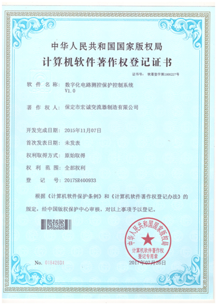 計算機軟件注冊權登記證書——數(shù)字化電路測控保護控制系統(tǒng)V1.0