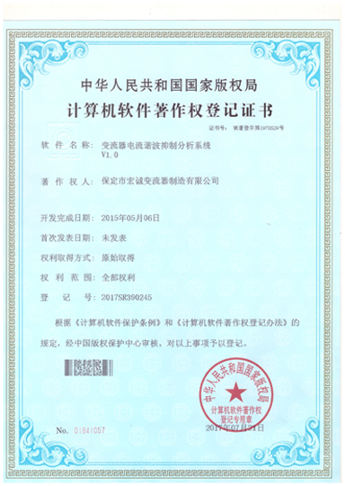 計算機軟件注冊權登記證書——變流器電流諧波抑制分析系統(tǒng)V1.0