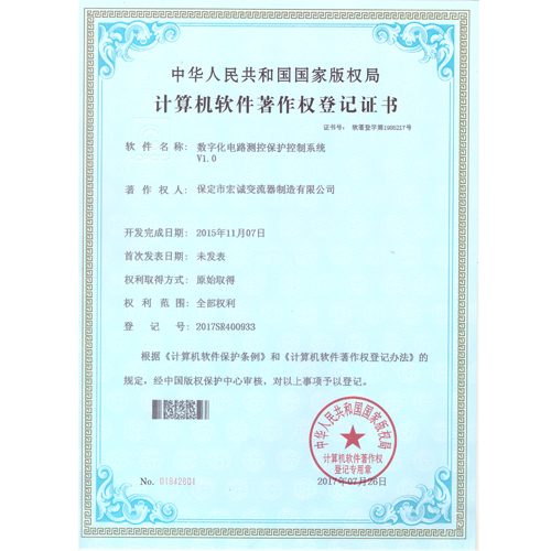 計算機軟件注冊權登記證書——數(shù)字化電路測控保護控制系統(tǒng)V1.0