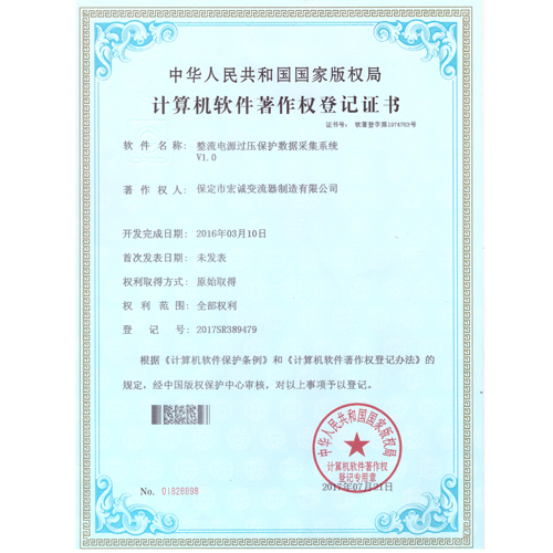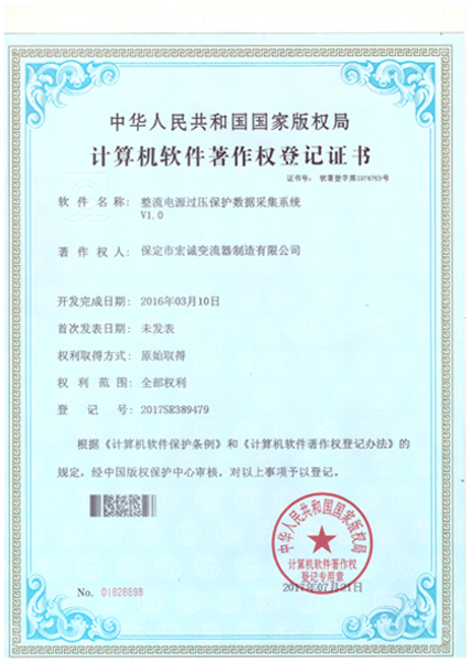 計算機軟件注冊權登記證書——整流電源過壓保護數(shù)據(jù)采集系統(tǒng)V1.0
